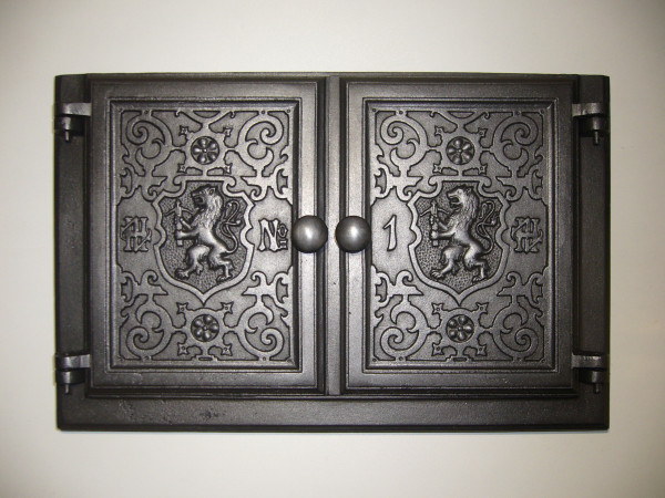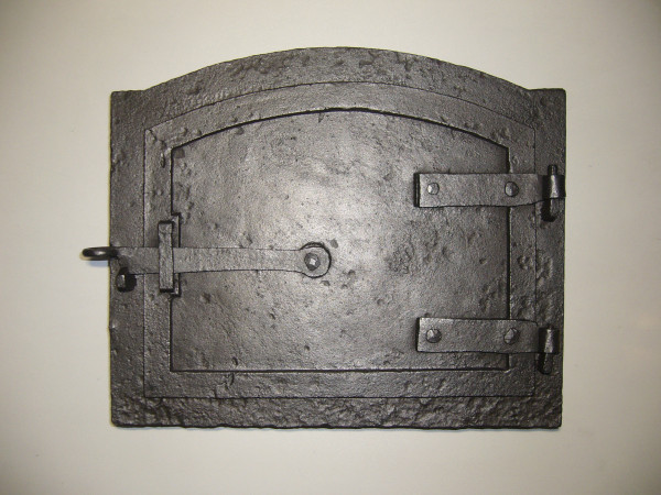 Lucka och ram i gjutjärn, gångjärn och lås i smidesjärn.